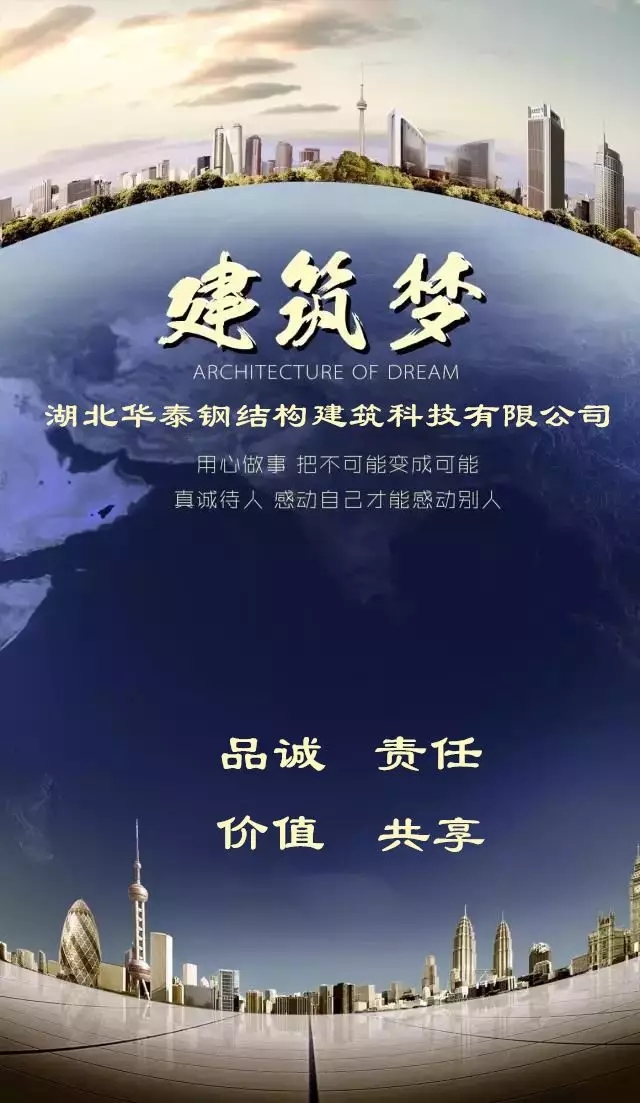 華泰鋼構地處中國明星城市、曹禺故里龍蝦之鄉的潛江市園林科技工業園,漢宜高速、滬蓉高鐵、318國道貫穿全境,交通便利,區位優勢明顯,熱忱歡迎社會各界朋友光臨我公司考察、洽談業務。我公司秉承“品誠、責任、價值、共享”的企業文化理念,愿與社會各界真誠合作,共創鋼結構事業美好未來。